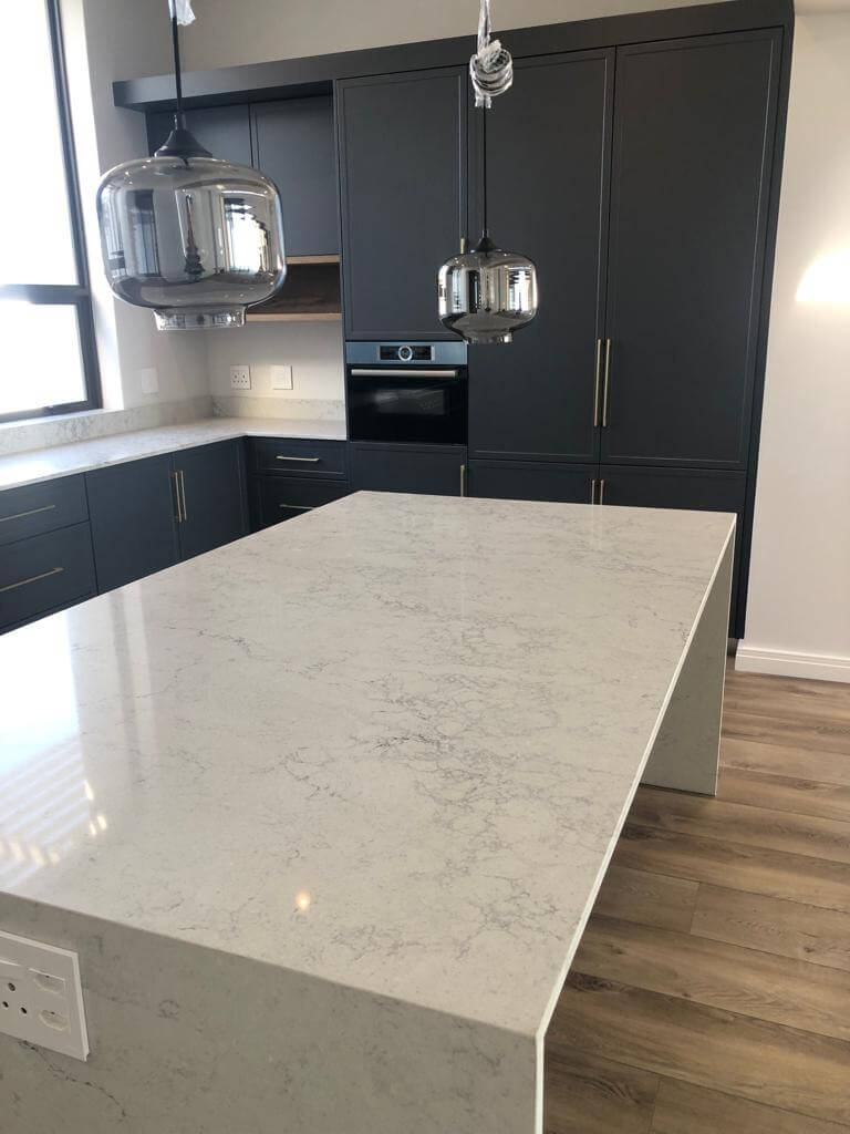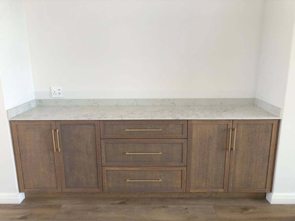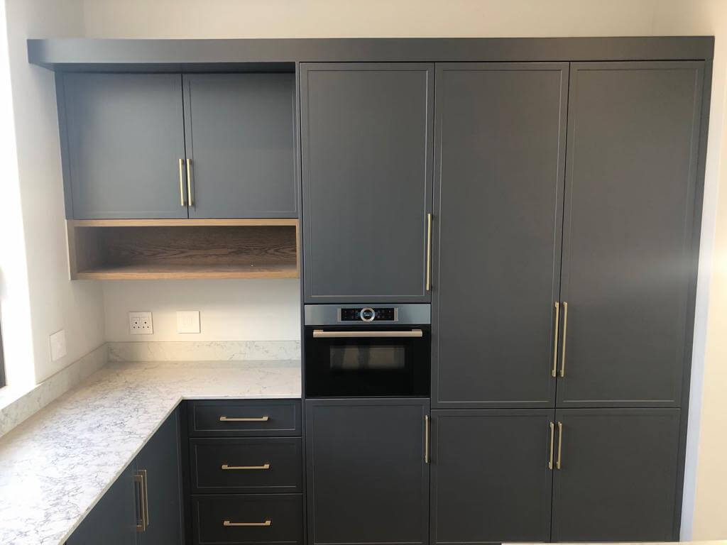 A perfect combination of Folkstone grey Duco (Painted) Quaker Supawood Doors and Oak Veneer Quaker wooden doors. This is perfectly complimented with Golden handles to give this design the perfect finish.