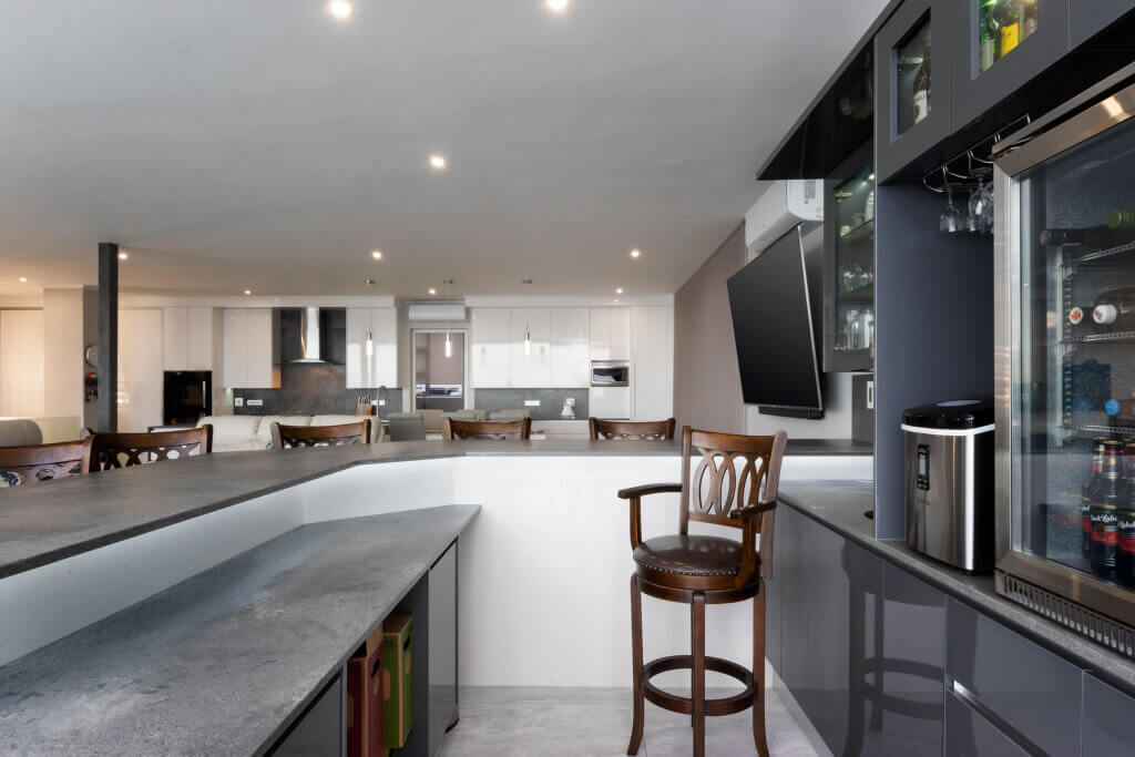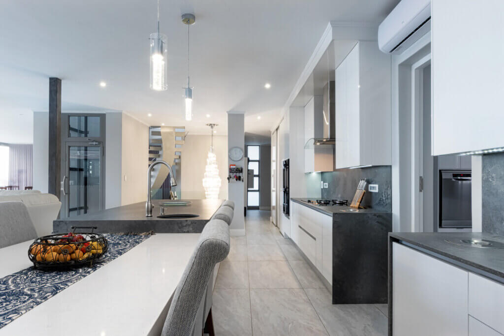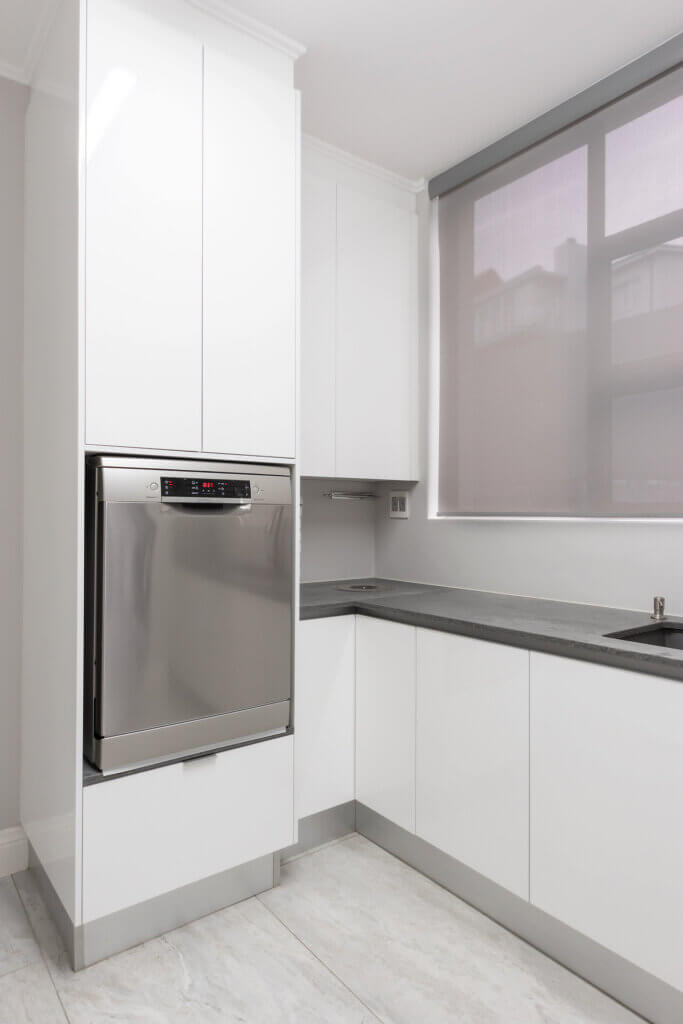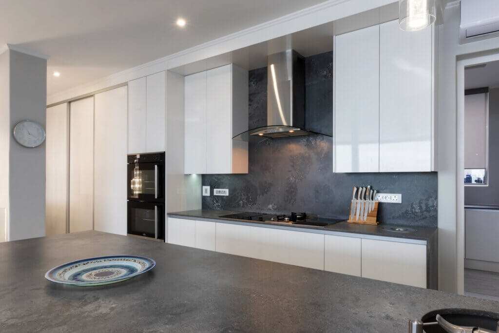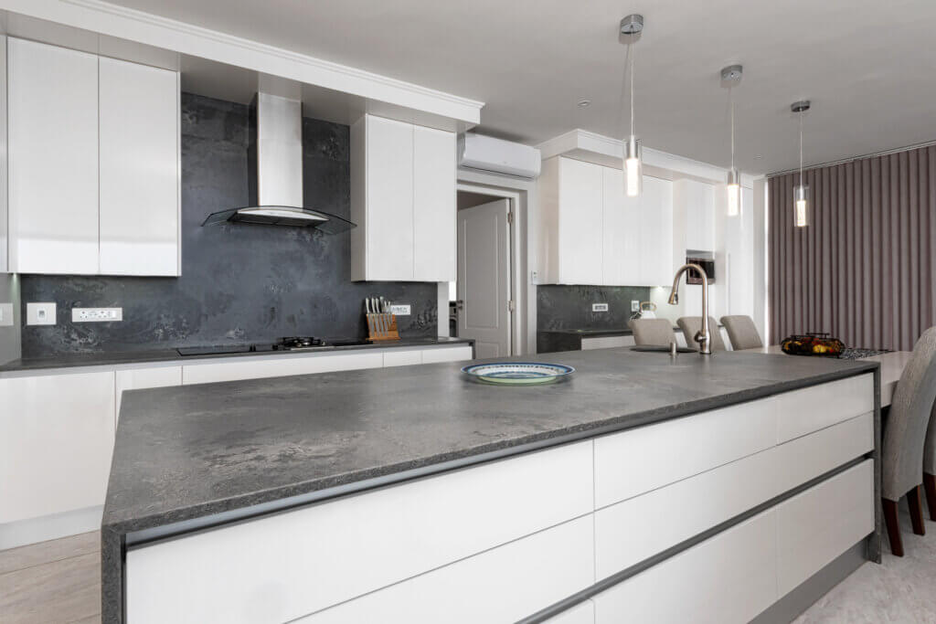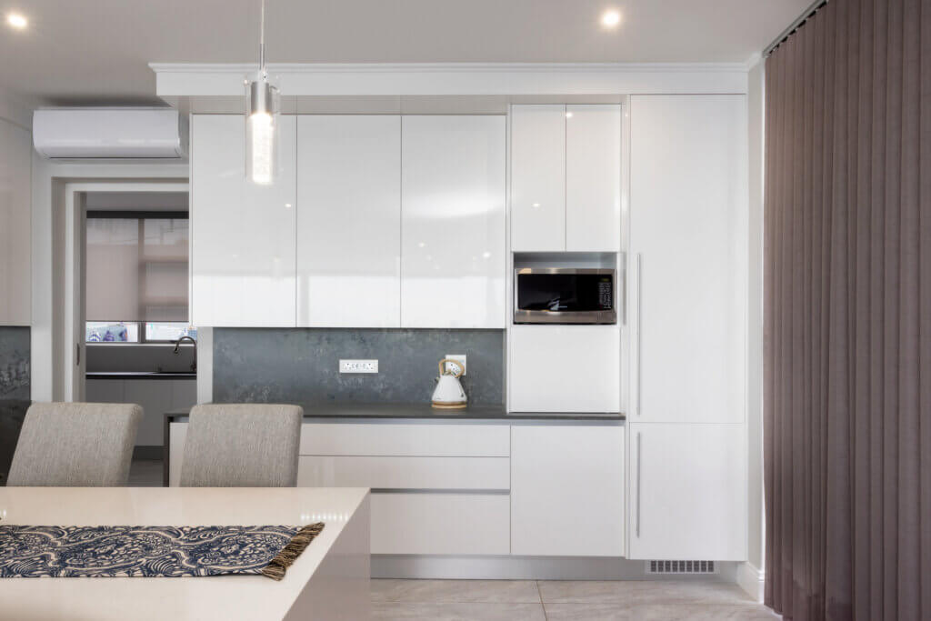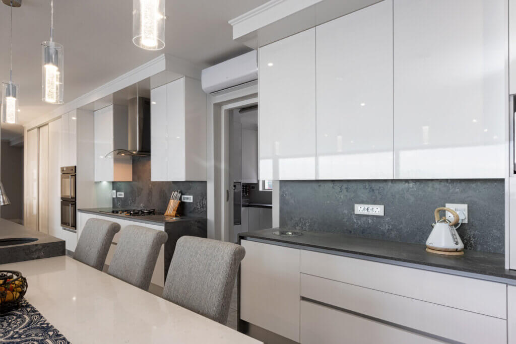 A Summer White HighGloss Kitchen paired with the beautiful Rugged Concrete Caesarstone. This modern design meet ones every practical yet simplistic needs.