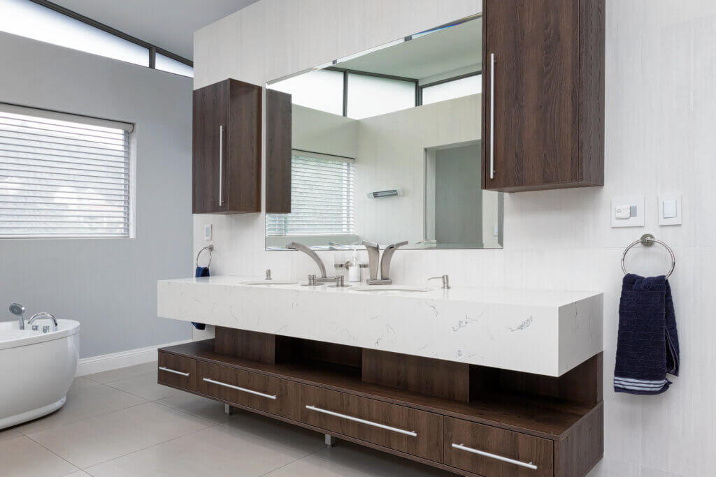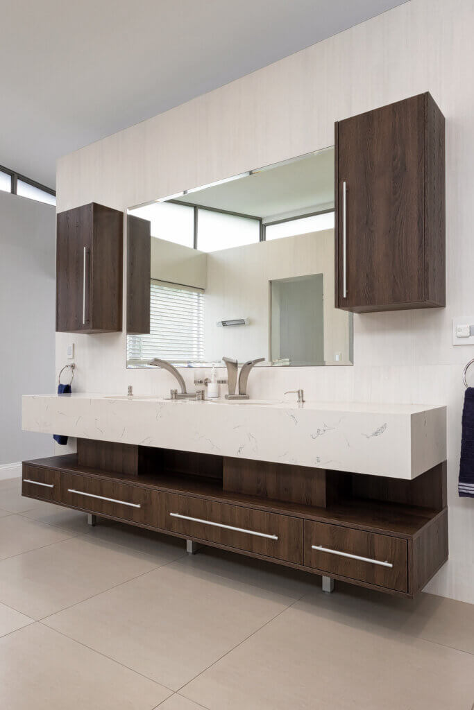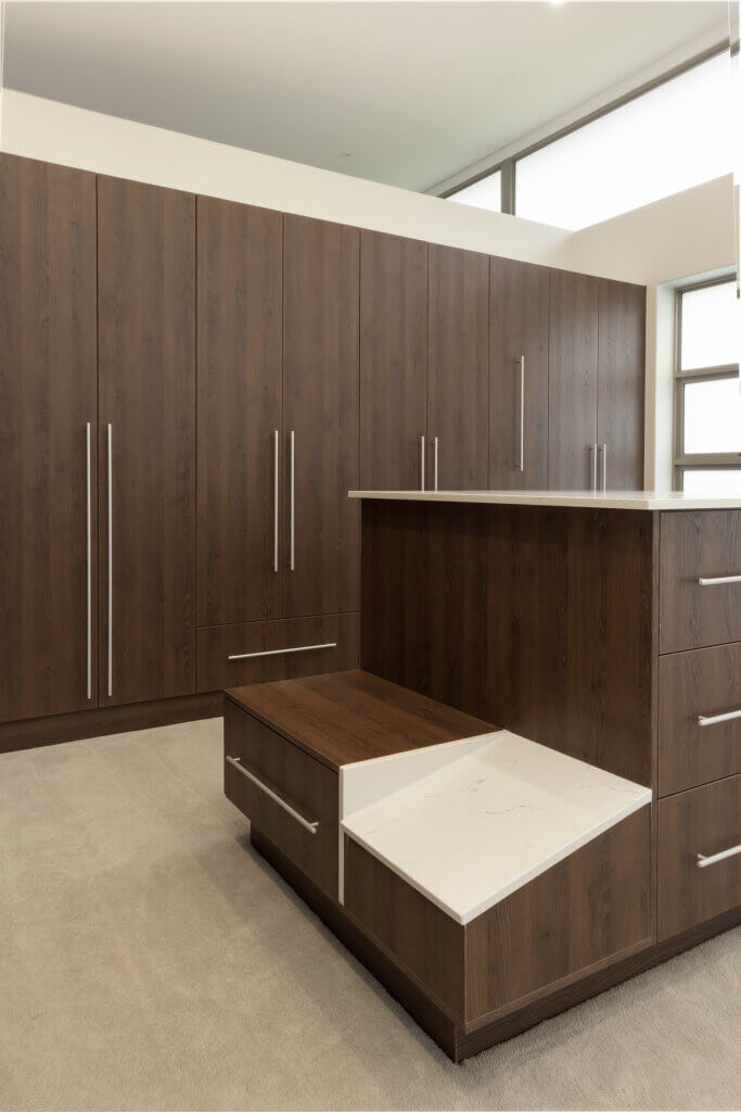 We used a the Egger Melamine Tobacco Gladstone Oak with Whisper Eezi Quartz worksurfaces. What a great pairing indeed.